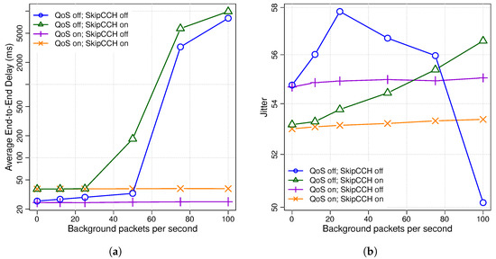 Regarding jitter, Figure 8b clearly shows lower and constant values (for any traffic load) when QoS is activated. The combination with the SkipCCH proposal activated is the one that obtains better jitter values. However, the differences in jitter values are not very significant in this case.