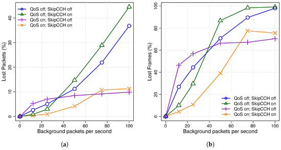 When enabling SkipCCH, it can be seen that both the packet and frame loss rates are significantly reduced. For example, without Quality of Service, the frame loss rate (Figure 9b) at low network loads (12, 25 pps) reaches 26% (SkipCCH on) and 44% (SkipCCH off). When enabling QoS and the SkipCCH method, the frame loss rate drops from 46% to 4% (at 12 pps) and from 56% to 10% (at 25 pps).