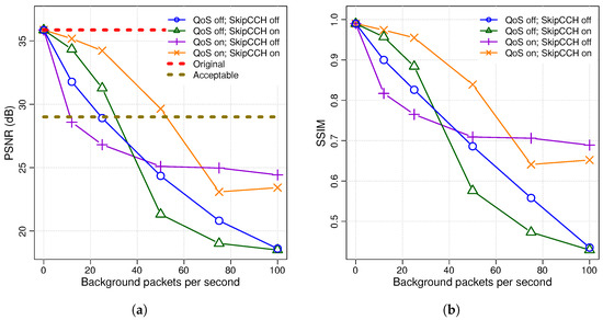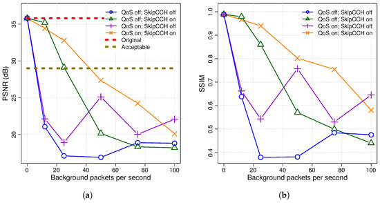 In Figure 10a, PSNR quality measurement, we have defined two thresholds: (a) an upper threshold of 35.86 dB as the quality of the encoded video (Original label), and (b) the lower threshold of 29 dB (Acceptable label), considered as the minimum video quality level established by the application. The explanation of these results is in accordance with the ones given for the packet/frame loss rates, showing that the best option is to enable both QoS and SkipCCH mechanisms to achieve at least an acceptable video quality for low to moderate network traffic loads.