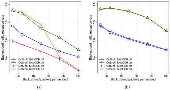 In Figure 11, we show the PDR, end-to-end delay, and PLR statistics. All of them show a behavior that is similar to that of the statistics explained in the previous section. It should be taken into account that this network setup never reaches high network loads and is always far from network saturation. This fact explains the differences between both setups in terms of absolute values. In Figure 11a, we can see the PDR curves, where the best option (QoS on; SkipCCH on) achieves values higher than 94% for all background traffic loads. In Figure 11b, the end-to-end delay confirms that, when using SkipCCH, there is an average increase around 16 ms (≈75%). In Figure 11c, the PLR curves are shown. In this setup, the differences between using or not using the SkipCCH method are more relevant, which is especially significant for medium to high background traffic loads. However, when QoS is enabled, the differences are not so relevant, keeping PLR rates from 0.33% to 6% when SkipCCH is also enabled.
