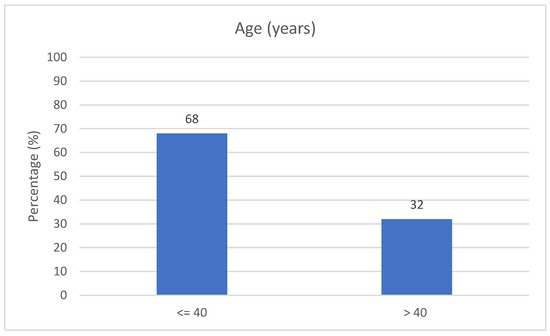 We observed a total of 72 (68%) participants with 40 or fewer years and 34 (32%) with more than 40 years old (see Table 2, Figure 2).