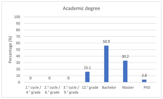According to the participants’ academic degree, the majority have a bachelor’s degree (N = 54, 50.9%), followed by a master’s (N = 32, 30.2%), then 12.° grade (N = 16, 15.1%) and finally a PhD (N = 4, 3.8%) (see Table 4, Figure 4).