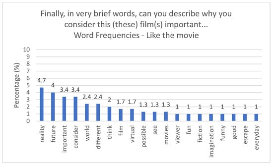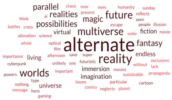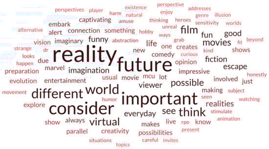 Technology has continuously transformed our lives, creating new ways of communication and virtual realities, and the entertainment area is the main factor in our engagement with today’s technologies that help transform the human vision and redefine narratives as something to dwell on instead of just observing [7], potentially identifying themselves in sci-fi novels [8] or other, being, for example, the animation area has to be understood as a creative strategy [9]. People and societies have already adopted many technological innovations that gain life through the world of fiction [10], allowing science fiction writers to forecast future developments and, therefore, the causal influence of real-life technological innovation [10]. In recent years, a large number of studies have focused on understanding the influence of fictional stories through variables such as knowledge about real-world issues [11,12,13], attitudes and beliefs [14,15,16], behavioral intentions [17], the self-concept [18,19] and the theory of the mind [20,21]. Hence, using animation and virtual visual special effects, the cinema and entertainment area allows us to immerse in alternative realities, perceiving them as if they were real. So, to what extent may a film help us understand the immersion in a Metaverse? Do films help or induct spectators to accept the Metaverse, the multiverse and virtual reality?