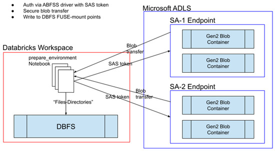 Microsoft Azure Data Lake Storage (ADLS) Gen2 is a huge cloud storage platform built on Azure BLOB storage capabilities optimized for big data analytics workflows. The hierarchical namespace feature enables the organization and structure (directories/files) that you would expect from local file systems with all the power of a distributed storage platform behind it. This allows ADLS to scale easily to big workloads. Access control is achieved via integration with the Azure Active Directory (AD), which manages authentication (for both users and developers’ applications), authorization, and encryption both at rest and en route to application endpoints. ADLS is capable of managing a robust array of data types including JSON, CSV, Parquet, DAT, plain text, and Binary Large Object files. In a project where data were dumped to ADLS by a third party, the data versioning functionality of ADLS allowed us to trace changes to data over time and revert to previous versions if needed. The common use case for ADLS is as a storage medium for the raw and unstructured part of the data lifecycle in an analytics pipeline. Our models would eventually train on pre-processed integrated representations of the very same data present in ADLS. We divided our data lake into namespaces called Storage Accounts (SAs). The SA acted as a sort of software context for access control and configuration. After configuring each SA to hold raw data for each relevant source (historic weather data, energy consumption data, hard sensor data, etc.), we were able to have finely tuned control over each source individually without the added complexity of multiple data lake resources. Stepping down from the SA, the BLOB container held different types of data. For example, after applying manual preprocessing steps to energy consumption, DAT files might be moved from the ‘reference’ container to the ‘output’ container. Generally, however, the BLOB container functioned one-to-one with the SA, as most of the data preparation would happen on the workspace/compute platform outputting to the data warehouse technology. The BLOB storage pattern is a cost-effective way to manage large amounts of unstructured data in these containers and is best applied to static applications. Since the most frequent writes to ADLS occurred roughly every 48 h, the BLOB pattern suits our use case. Additionally, reading the Binary Large Objects happens in near real-time once a copy is moved to the workspace file system (Databricks FS) or in-memory given that they are random access. Accessing ADLS from our workspace/compute platform was admittedly a challenge. To read our data from ADLS, we needed to mount the Gen2 BLOB storage containers as directories on the Databricks Distributed File System (DBFS) [8]. This involved three primary steps: booting a Spark context, authenticating with the SA via some secure protocol, and finally, using Databricks’ utilities to perform the FUSE (file system in user space) mount operation [9]. Given that Databricks is our primary compute workspace and provides APIs for accessing external resources such as data lakes, this was the best home for the ‘prepare_environment’ script responsible for pulling in the containers from all relevant Storage Accounts. See Figure 1.