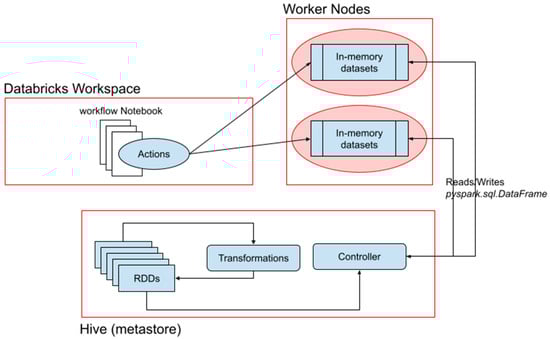 Interaction between Hive, in-memory datasets (Spark DataFrames) and the various workflow notebooks in the pipeline.