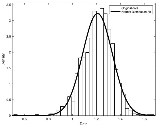 This histogram visualizes the proximity of the dataset to a normal distribution. The MATLAB Distribution Fitter was used to fit the normal distributions to the data with Parameter Estimate: mu = 1.20889 (Std. Err. 0.00361506) and sigma = 0.123707 (Std. Err. 0.00255787).