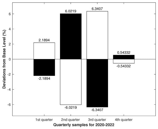The samples are based on records from 1 January 2020 to 31 December 2022. In the graph, the numbers at the ends of the bars indicate the deviation of the white-to-black ratios from the Base Level (). The quarterly samples from 2020 to 2022 show an alternation in white-to-black ratios, with black dominance in the second and fourth quarters and white dominance in the first and third quarters. From the first to the third quarter, the amplitude of deviations increases and falls sharply in the fourth quarter.