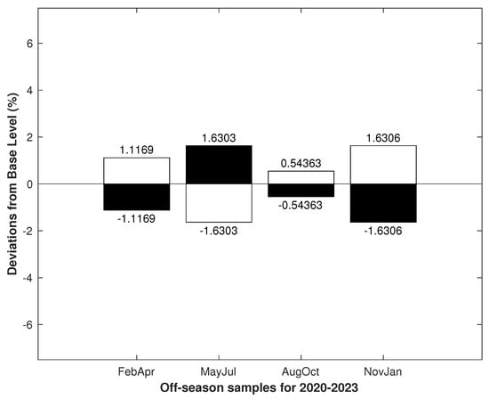 The samples were based on records from 1 February 2020 to 31 January 2023. The numbers at the ends of the bars indicate the deviation in white-to-black ratios from the Base Level (). In the off-season samples, the alternation in the white-to-black ratio was broken. The predominance of white over black began in August and continued until January.