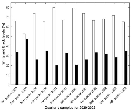 The samples were based on records from 1 January 2020 to 31 December 2022. The quarterly alternation in white-to-black ratios () was typical from the first quarter of 2020 to the fourth quarter of 2021. The alternation sequence was broken from the fourth quarter of 2021 to the second quarter of 2022. The alternation was restored from the second quarter of 2022 to the fourth quarter of 2022, but with a noticeably smaller amplitude.