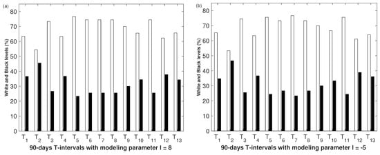 Let us denote D as the time-ordered set of all records of the Trager coefficient values. Let us divide this set into two subsets: subset W (which contains records with values within one standard deviation of the mean) and . Now, we have set W with moderate variance and set B with high variance. Therefore, . According to Table 2, we see that, in set D, 68.66% of the elements are elements of set W and 31.34% of the elements are elements of set B. Therefore, we can determine the Base Level () of set D as 68.66% W (“Whites”) vs. 31.34% B (“Blacks”). For any subset of D similarly, we can determine the white level vs. black level () as a percentage of the number of elements for and ; thus, we can talk about the white-to-black ratio for . Now, we can compare the white-to-black ratios with the Base Level as for different samples.
