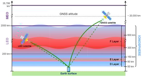 Amongst these multiple sources, ionospheric delay, which is the focus of our paper, stands out as the most significant error source [17,18], at least in all GNSS systems. This delay is induced by the “ionospheric layer”, or simply “ionosphere”, which is a part of the Earth’s atmosphere, ranging approximately from 50 km to 2000 km in altitude [19,20]. Figure 1 represents this region according to its layer description in [21] and with respect to LEO and MEO satellites. The figure also shows how atmospheric layers typically delay the signal by making them follow a path (green line) that is longer than the straight path (dotted green line). The ionospheric layer is typically divided into three sub-layers, D, E, and F, as shown in Figure 1. The most critical region for ionospheric activity is the F layer, shown in bright red in, which spreads from around 300 km to around 600 km above the Earth. The ionosphere can induce positioning errors of up to 100 m on passing signals [22]. Therefore, it is crucial to mitigate its impacts by modelling its effects.