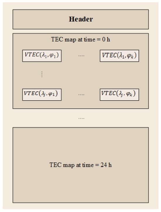 These maps contain, among other information, TEC maps for each epoch (see an explanation in Figure 2, where stands for longitudes and stand for latitudes at point i). These maps are captured at a discrete time every 2 h for 24 h from 00:00 h to 00:00 h the next day, yielding a total of 13 ionospheric maps, each containing TEC values for latitudes