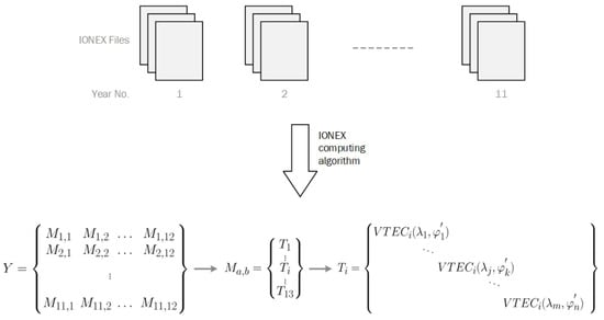 Next, we used a Matlab code to read all the collected files and generate all the required TEC values, which were then stored in the Y matrix. The data collection and arrangement process is illustrated in Figure 4. The Y matrix has a total number of VTEC values, representing 11 years (one complete solar cycle), 12 months, 13 time instances, 71 latitude values, and 73 longitude values. The year and month data are divided into a set of matrices, where a and b correspond to the year and month, respectively. Every matrix is divided into 13 submatrices, where i represents the time index. These submatrices are arranged systematically, with a 2-h interval between adjacent submatrices. Lastly, every matrix contains a total of VTEC values, corresponding to 71 different latitude values and 73 different longitude values that span the entire Earth with a spatial resolution of degrees for latitudes and 5 degrees for longitudes. This systematic arrangement of data provides a comprehensive representation of VTEC values by latitude, longitude, time of day, month, and year.
