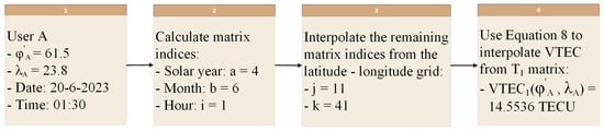 Figure 5 gives a step-by-step example of how the VTEC value of a user is calculated using IAMM. Step 1 tells us that the user is located at Tampere University on 20 June 2023 at 01:30 AM. In step 2, we calculate the solar year based on the user’s year and Table 2, and we calculate other matrix indices corresponding to the user’s date and time. Step 2 tells us that the VTEC value is located in matrix and sub-matrix . To interpolate the VTEC value from the latitude–longitude matrix, we calculate indices j and k based on linear interpolation from the latitude–longitude grid that is defined in the IONEX format datasheet in [7,48]. Finally, in step 4, we use Equation (8) to interpolate the VTEC value for user A from the sub-matrix.