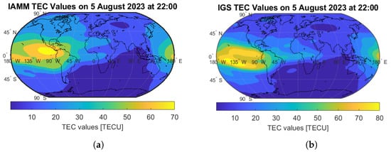 To confirm that our model produced reliable values for ionospheric electron content, we compared the TEC values generated by our IAMM model with those generated by IGS. A snapshot of this comparison is shown in Figure 6a (IAMM) and Figure 6b (IGS) for a period of high solar activity, which happened, for example, to be on 5 August 2023 at around 22:00, according to a report by the National Oceanic and Atmospheric Administration (NOAA) [58]. We chose this date as an illustrative example to show that our model is able to generate reliable TEC values even during periods of intense solar activity. As seen in Figure 6, there is a high similarity between the TEC values generated between the two models.