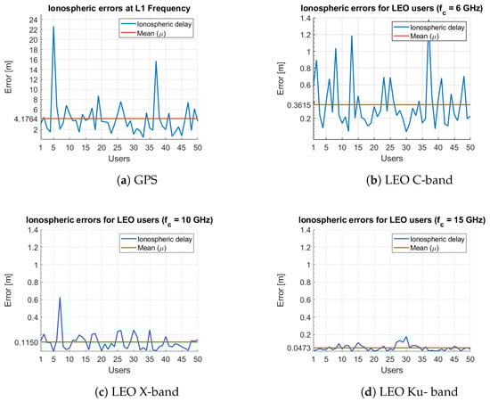 There are several existing models in the literature that aim to mitigate ionospheric delays, such as the NeQuick, Klobuchar, BeiDou Global broadcast Ionospheric delay correction Model (BDGIM), and Quasi-4-Dimension Ionospheric Modeling (Q4DIM) models [23]. These models measure or predict the error induced by the ionosphere, depending on the user’s location, time of day, and day of the year [24,25]. However, all of these models are tailored for correcting errors for GNSS signals and, therefore, cannot be directly applied to signals from LEO satellites. The primary reason for this is the altitude difference between the orbits of the MEO and LEO.