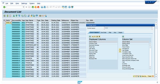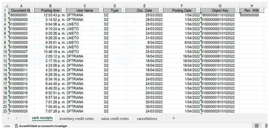 Figure 5 shows the data extracted from the SAP S4Hanna system to Excel. The information extracted from the transaction is separated by sheets, in this case the data of cash receipts, credit notes affecting finished goods inventory, value credit notes and invoices are displayed along with their cancellations, if any. The data kept in the data are: Document Number, Entry Time, User Name, Document Type, Document Date, Posting Certificate, Reference Key, and Canceled With.