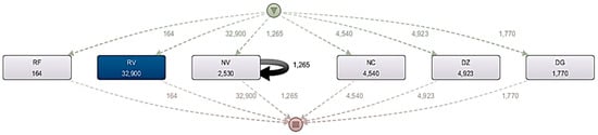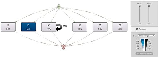 Figure 13 allows us to observe the frequency of the activities of the invoicing processes, which reflects a higher frequency in the RVs with 70.26%, which are the invoices and the central axis of the processes analyzed, and also the frequency of the DZ and DG, which are the cash receipts with 12.28% of the records each. The apparent discrepancy between the high percentage of invoice records and the lower percentage of cash receipts may be due to payment consolidation, as customers pay multiple invoices at once, with individual records being grouped into a single payment. The difference in percentages does not indicate an error. It reflects the nature of the payment process, where customers consolidate payments and cash receipts record the entire transaction, not each invoice.
