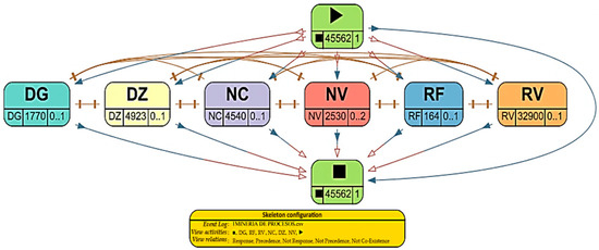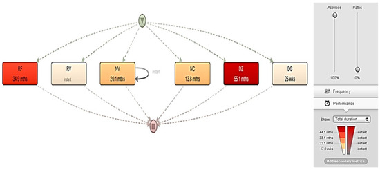 Figure 7 illustrates the map of the invoicing processes in the pharmaceutical sector of Colombia, which allows us to visualize the real flow of the invoicing processes, taking into account the activities that are invoiced (RV), cancellations (RF), cash receipts (DZ-DG), value credit notes (NC) and inventory credit notes (NV). In addition, the absolute frequency of the activities is shown, the frequency of RF was 164, RV 32.900, NV 2530, NC 4540, DZ 4923 and DG 1770. Taking into account the absolute frequency, the 3 main processes in the case study that occur most frequently according to the process map are Invoices (IR), Credit Notes (NC), and Cash Receipts (CR). Similarly,