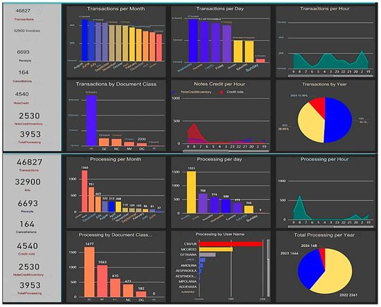 Figure 10 shows the analysis of the results presented in the dashboard, highlighting several key aspects of transaction processing. A total of 46,827 transactions were recorded, divided into 32,900 invoices, 6693 receipts, 164 cancellations, 4540 credits, and 2530 inventory credits, for a total of 3953 processes.