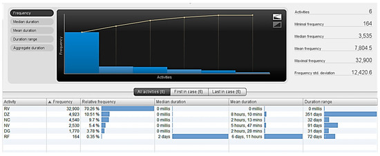 Figure 9 shows the frequency for each activity of the invoicing process; the frequency of RF was 0.36%, of RV was 72.2%, of NV was 2.78%, of NC was 9.96%, of DZ was 10.8%, and of DG was 3.88%. The frequency of cases provides valuable information about the efficiency of the processes, understanding the general distribution of cases, and identifying behavioral patterns in the processes. In the case study, a higher frequency is reflected in the activities RV invoices of 72.2%, followed by DZ cash receipts of 10.8% and NC value credit notes of 9.96%, likewise, the least frequent activities are RF cancellations of 0.36%, NV credit notes for inventory of 2.78% and DG cash receipts of 3.88%. When analyzing that the highest frequency of cases is reflected in the RV invoices of 72.2%, this indicates the efficiency and high performance of this activity in relation to others, since invoices constitute a crucial activity in the billing process, also when observing the high frequency in DZ cash receipts of 10.8% represents efficient management in the collection process, likewise, the lower frequency of RF cancellations of 0. They do not reflect an inefficiency or a bottleneck in the invoicing process, since having a lower number of cancellations and credit notes for inventory reflects the efficiency in the invoicing process and does not generate risks in the invoicing process, which is the main activity of the process. In this paper, business intelligence facilitates the monitoring of the process derived from process mining through visual dashboards. In summary, the above figure helps to identify activities that could potentially become bottlenecks or an additional burden in their normal execution within the process. The frequency data allows the decision makers in this case study to determine which billing activities may be at risk of saturation and rework.