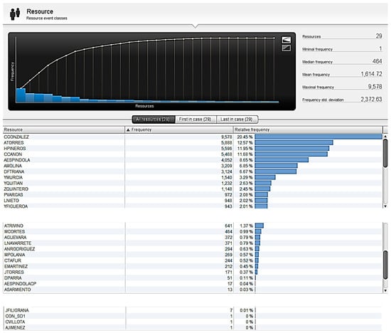 Figure 14, which shows a dashboard containing statistics on the resource usage by users. The figure shows that the user CGONZALEZ has appeared in the largest number of events with a frequency of 9578 times. This represents 20.45% of the total number of occurrences of all resources. The next most frequent users are ATORRES, HPINEROS, CCANON, and AESPINDOLA, as well as the resources CGONZALEZ, ATORRES, HPINEROS, CCANON, and AESPINDOLA that have been used the most by users.