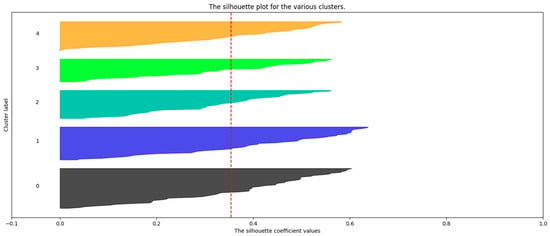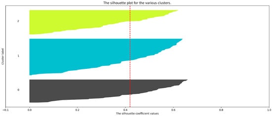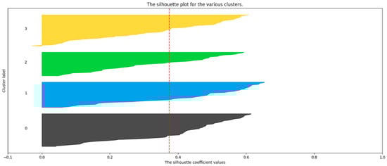 The other method is the silhouette method. It measures the quality of clustering by calculating the silhouette coefficient for each data point or word. This value ranges from −1 to 1, where a low value indicates that the data point is poorly matched to its own cluster and well matched to the neighboring clusters. The optimal number of clusters k is usually the one that maximizes the average silhouette coefficient across all data points and the one that has the silhouette widths approximately the same.
