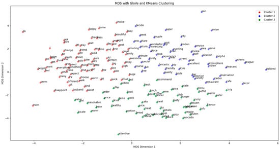 In Figure 9, the clustering of the most common 200 words is shown. Only adjectives, verbs, and nouns were considered since non-abstract dominant topics are more significant in textual analysis. The three identified clusters represent different aspects that customers value in a restaurant experience: