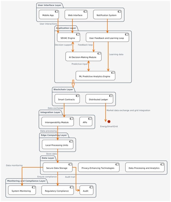 The vehicle energy sharing through AI (VESTA) framework introduces an innovative approach to vehicle-to-grid (V2G) energy sharing, designed to enhance grid stability, optimise user engagement, and support sustainable energy practices. By integrating advanced technologies with user-centric principles, VESTA ensures that every aspect of V2G energy sharing is managed with precision and adaptability. The framework’s architecture is presented in Figure 2. It comprises of several interconnected layers that addresses the complex challenges faced by modern energy systems, focusing on user consent, context-aware operations, privacy, and security through the implementation of smart contracts and AI-driven decision-making.