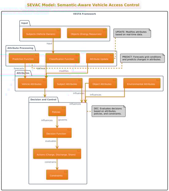 At the heart of VESTA, the SEVAC model provides an access control mechanism for classifying vehicles and making optimised access control decisions. By incorporating semantic awareness into the decision-making process, SEVAC ensures that critical vehicles, such as emergency services, are prioritised appropriately while still respecting the needs and preferences of individual users.