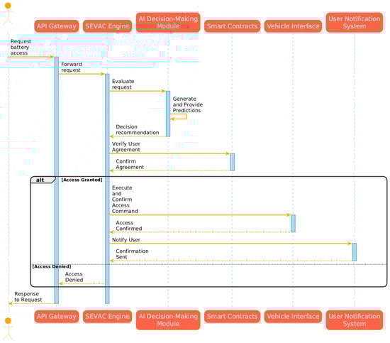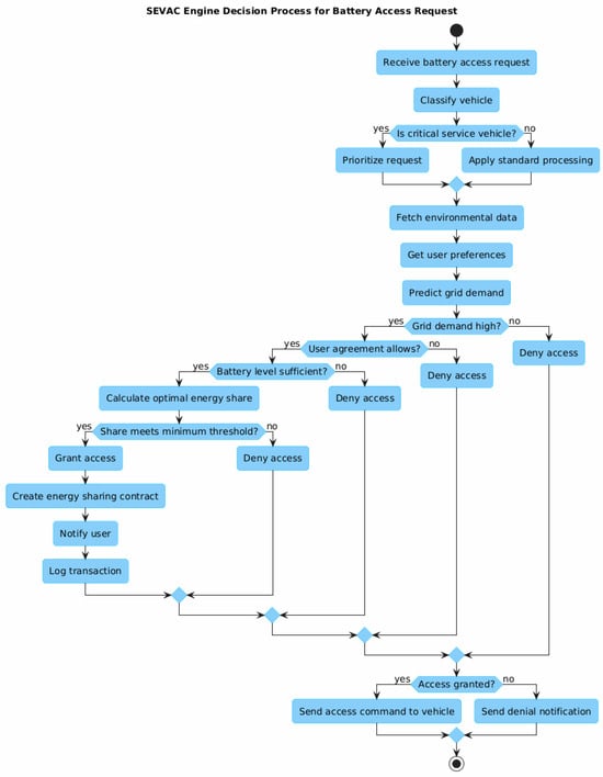 The framework design process involved defining the core components of VESTA and developing the SEVAC model to incorporate context, location, vehicle types, and user permissions. It included designing the integration of AI decision-making modules for adaptive control and incorporating blockchain technology for secure and transparent transactions. Ensuring scalability and flexibility to accommodate various V2G scenarios was also a key consideration. The VESTA framework was developed through an iterative design process. This involved applying attribute-based access control (ABAC) principles, refining these with context-aware decision-making, and integrating AI-driven predictive models and blockchain technology. Specifically, the semantic-aware vehicle access control (SEVAC) model was built using first-order logic for policy formulation, enabling it to adapt to varying V2G conditions, vehicle types, and user permissions. Each vehicle’s context, including its location and charge status, informed real-time energy-sharing decisions, creating a dynamic and responsive system.