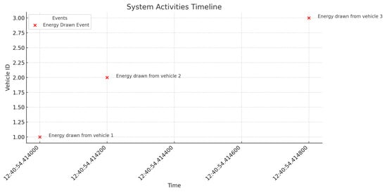 Figure 6 illustrates the timeline of system activities throughout the simulation. The timeline reveals the sequence and frequency of energy-drawing events, demonstrating VESTA’s responsiveness to grid demands. The system efficiently logged multiple energy-drawing events in quick succession, indicating effective decision-making and rapid response to the simulated high-demand scenario.