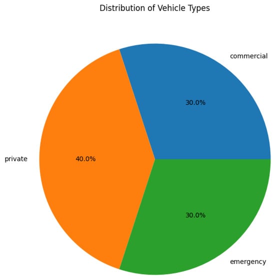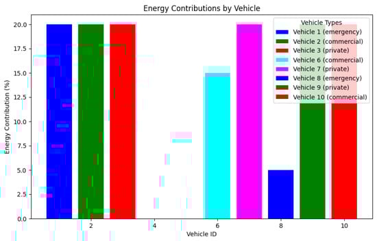 The simulation incorporated a diverse set of vehicle types, which was crucial for reflecting a realistic V2G scenario. Figure 7 shows the distribution of these vehicle types, a key factor influencing energy-sharing priorities within VESTA.