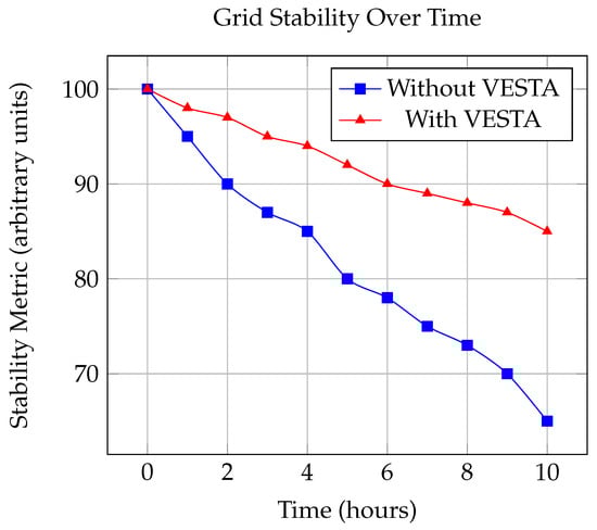 The VESTA framework demonstrated a positive impact on grid stability, particularly during simulated high-demand periods. Figure 9 illustrates the grid stability metrics over time, comparing scenarios with and without VESTA intervention.