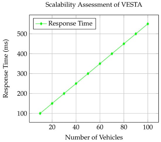 The simulation results suggest that VESTA is capable of scaling effectively to manage larger networks of vehicles. However, the system’s performance under more complex scenarios with a higher number of vehicles remains an area for future research. Figure 11 explores the potential scalability of VESTA by analysing the system’s response time as the number of vehicles increases.