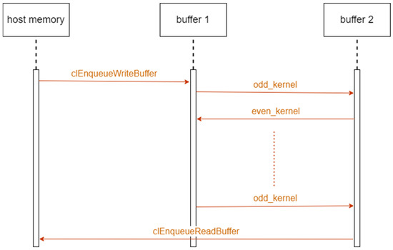 During each timestep, the calculation uses the value of the neighboring cells. To ensure that none of these neighboring values has been updated by parallel cell computation—i.e., the before-step value of all the neighbors is used—two memory buffers are necessary [28]. During odd timestep computations, buffer 1 is read while buffer 2 is written to. During even timestep computations, buffer 2 is read while buffer 1 is written to, as follows (Figure 1):