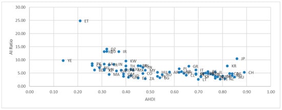 African nations present varied patterns. Ethiopia, for instance, shows an extremely high ratio in AI research despite a low AHDI, which could indicate targeted investment in technical AI capabilities. However, data for many African countries are limited, making broader regional conclusions difficult.