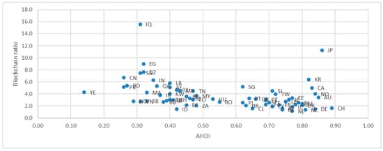 Scatterplot of blockchain SCIE/SSCI ratio vs. AHDI. Outliers that will be excluded from analysis: Iraq, Japan. Source: Authors’ analysis.