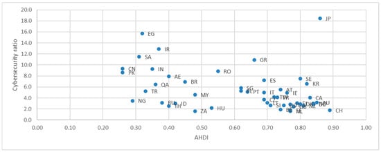 Scatterplot of cybersecurity SCIE/SSCI ratio vs. AHDI. Outliers that will be excluded from analysis: Japan. Source: Authors’ analysis.