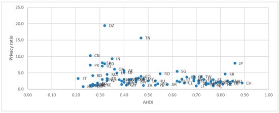 Scatterplot of privacy SCIE/SSCI ratio vs. AHDI. Outliers that will be excluded from analysis: Algeria, Tunisia. Source: Authors’ analysis.