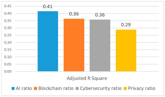Adjusted R-square values of our models range from 0.288 to 0.415, indicating moderate explanatory power of the social factors for technical to social focus ratios across the selected research fields. The AI ratio model shows the highest adjusted R-square (0.415), suggesting that social factors explain a larger portion of the variance in AI research focus compared to other domains. Blockchain and cybersecurity models have similar values (0.363 and 0.357, respectively), while the privacy model has the lowest (0.288).