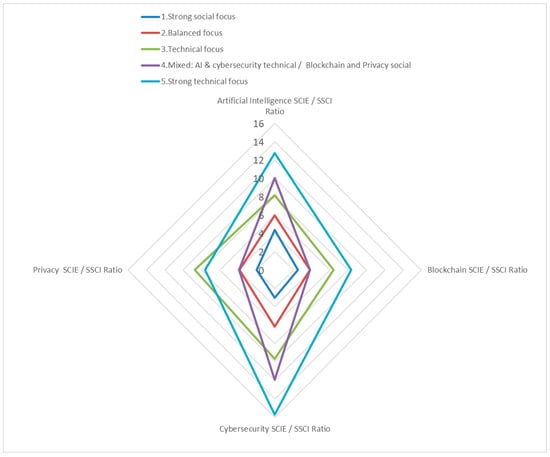 The cluster analysis identified five distinct profiles of countries based on their balance of technical and social science research across AI, blockchain, cybersecurity, and privacy technologies. The largest group, “Strong social focus,” included 53 countries, mainly Western nations, consistently showing the lowest ratios of technical to social science publications. The “Balanced focus” group of 25 countries, including several emerging economies, demonstrated a more even distribution between technical and social research. A smaller “Technical focus” cluster of six countries, including China and India, showed higher ratios across all domains, indicating a stronger emphasis on technical research.