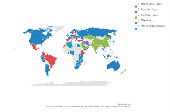 Regional patterns emerged, with most Western countries in the “Strong social focus” cluster, while many Middle Eastern and North African countries showed a stronger technical focus. East Asian countries like Japan and South Korea maintained a relatively high technical focus despite their high development levels. These findings reveal that countries’ approaches to balancing technical and social aspects of technology research are not uniformly determined by development level or region, but likely reflect national strategies, cultural factors, and development trajectories.