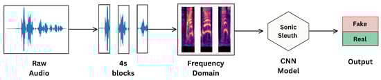 For feature extraction, we employ techniques like short-time power spectrum and constant-Q transform (CQT). These methods effectively analyze different frequency ranges, ensuring both high and low frequencies are thoroughly examined, which improves the detection of subtle audio manipulations. Figure 2 illustrates the overall approach for detecting deepfakes.