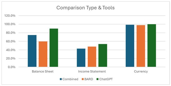 If we apply this typification to the questions, we can reflect on the answer quality (see Figure 2). In the group in which a text was expected (currency), the two LLMs reached 98.8% of correct answers. For the balance sheet, in which the questions indicate more common terms, the LLMs combined reached 74.7% correct answers. The income statement-related questions received at least 43% correct answers.
