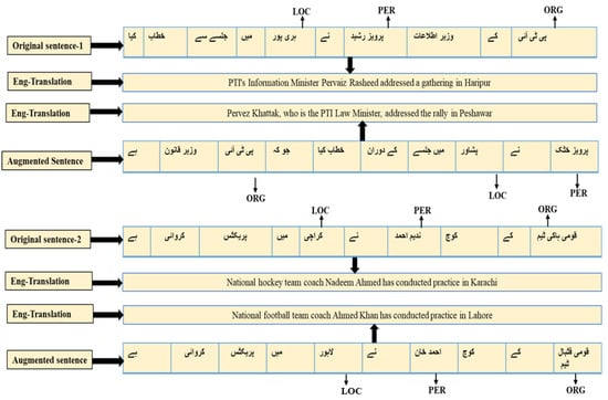 It was ensured that the repetition rate of NEs remained low by selecting words only if their occurrence in the text was below a specified threshold of 0.1. This strategic selection practice aimed to maintain diversity within our extended dataset, a crucial factor contributing to the subsequent development of an enhanced named entity recognition (NER) system for Urdu. An illustrative example of a generated new sentence is presented in Figure 2. We used a data augmentation method to increase the amount of text from 50,000 to 154000. The augmentation was implemented for three types of named entities: person, location, and organization. By means of inner augmentation, 47,000 additional annotated texts for a person, 14,000 annotated texts for location, and 30,945 texts for the organization were created. Our augmented dataset now comprises 160,132 tokens with 114,912 annotated NEs. The focus during the creation of our UNER-II corpus, which is the augmented version of the original UNER dataset, centered on four primary NE groups: person, location, organization, and others. This selection was based on the widespread implementation areas of these NE groups, considering that most existing datasets primarily encompass these types [24]. A comparative analysis between the extended dataset and the existing UNER corpus data is detailed in Table 2.