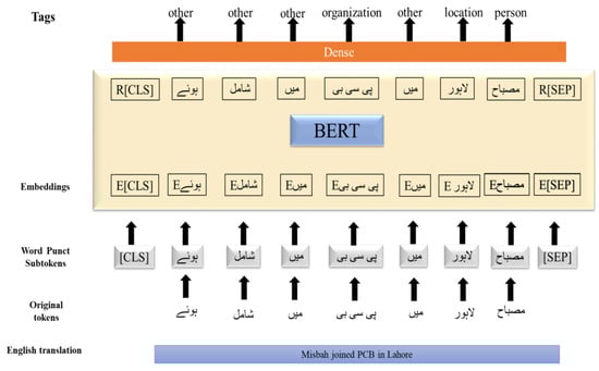 Transfer learning methods [28], such as pre-trained deep neural networks have demonstrated significant advancements in various natural language processing (NLP) tasks, including text classification [29], machine translation [30], and text summarization. Transformer models like BERT [28], ALBERT [31], and RoBERTa [32] have particularly excelled in NLP. These models undergo pre-training on extensive datasets, often sourced from Wikipedia articles, through unsupervised learning. They can then be fine-tuned for specific tasks like named entity recognition (NER). Unlike recurrent neural networks (RNNs), transformers do not process input sequentially. They rely on attention mechanisms, making them suitable for NLP tasks due to their intricate architecture, involving embedding layers, self-attention layers, and feed-forward layers. BERT [33] for instance, was trained with objectives involving masked language modeling, where it predicts masked words in a randomly masked input sequence, and next-word prediction, where it determines if two sentences follow each other. BERT achieved remarkable results across various language understanding tasks. For Urdu named entity recognition, our proposed BERT model architecture is illustrated in Figure 3.
