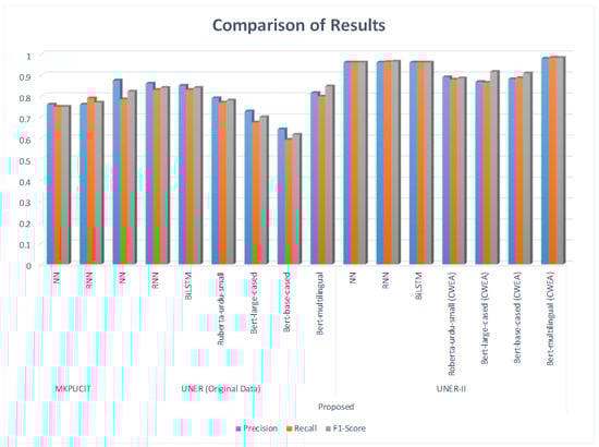 We leveraged the Urdu script to enhance the performance of Urdu NER. Moreover, we devised a data augmentation technique to expand the initial dataset. In this section, we present the results obtained by applying the BERT-multilingual model to both the original dataset and the augmented dataset. To assess the overall effectiveness of the final system, we employed Fida et al. [35] for the evaluation of metrics such as precision, recall, and F1 score.