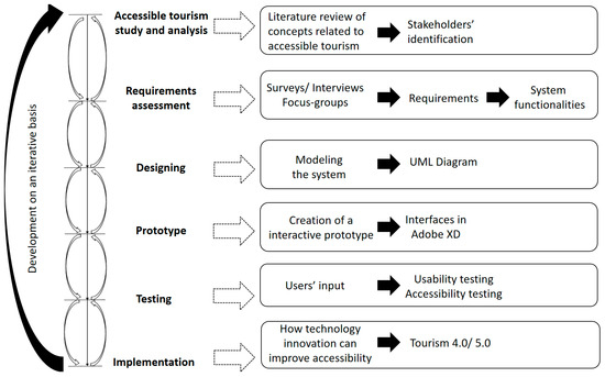 There have been attempts to introduce accessibility in software development, especially with the creation of the Web Content Accessibility Guidelines (WCAGs) [75], which consist of a set of validated guidelines that web developers should follow in order to ensure technology is accessible to all [76]. Despite the existence of valid standards, such as WCAGs, accessibility is still a lacking aspect across software development [77]. This was observed in earlier research from various fields, such as education [25], tourism [26], and healthcare [27], where new methodological approaches had to be created to meet specific accessibility needs. The solution to address the specific and diverse requirements was to place the focus on users. This is true in the accessible tourism market, where PwSNs and other stakeholders have distinct and specific requirements [78]. Different authors [79,80,81] indicated that lacking human perspective during development phases can lead to design faults and failed implementation processes [82]. Thus, it is recommended to follow UCD [83] and iterative [84] approaches, making systems more “usable” and accessible by focusing on the specific requirements of users [85]. However, there is a gap in current platforms regarding the users’ integration and placement of accessibility requirements at the heart of system development. This is verified in the few existing accessible tourism platforms (e.g., Tourism for All [86]; Hands to discover [87]; Euans [88]; Travability [89]; Tourismus für Alle Deutschland [90]; Tur4All [91]). Most of them clearly fail this integration, as demonstrated in a study comparing the diverse platforms performed beforehand and reported by Alves et al. [24]. Since technological platforms are ideal for disseminating information, and information is a critical aspect of tourism, there is a clear justification for using them to promote tourism for all since, as in any other field, information is the key to success. However, users must be involved in methodology processes because only then will a solution be truly accessible and cater to their requirements.