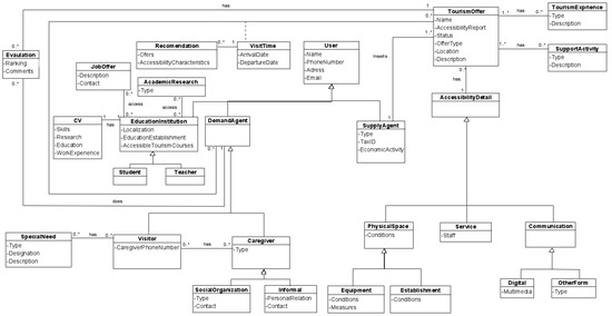 The class ‘SupplyAgent’ (e.g., accommodation units, bars, restaurants, tourist entertainment companies, and tourism attractions) will be responsible for placing the ‘TourismOffer’ on the platform. This ‘TourismOffer’ can take various forms (e.g., accommodation and cultural attractions (museums/monuments/theme parks)). For these reasons, it should be indicated if there is some type of ‘TourismExperience’ associated with it. For each ‘TourismOffer’, it is crucial to describe not only the provided ‘SupportService’ but also the accessibility conditions, with ‘AccessibilityDetails’, which can be divided into ‘PhysicalSpace’ (equipment and the establishments themselves), ‘Service’ (conditions of the existing support staff), and ‘Communication’ (forms of communication and the skills of human resources).